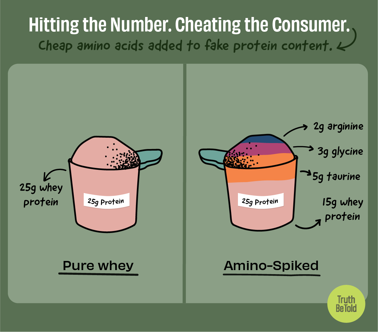 Protein content is typically measured by testing nitrogen levels (since protein contains nitrogen). Some manufacturers exploit this by adding cheap nitrogen-containing amino acids like glycine, taurine, or creatine to their products. These spike the nitrogen readings, making it appear there's more complete protein than actually exists. It's particularly deceptive because standard testing can't distinguish between nitrogen from complete proteins (which have all essential amino acids your body needs) versus nitrogen from cheap fillers. (More details in this previous TBT article.)