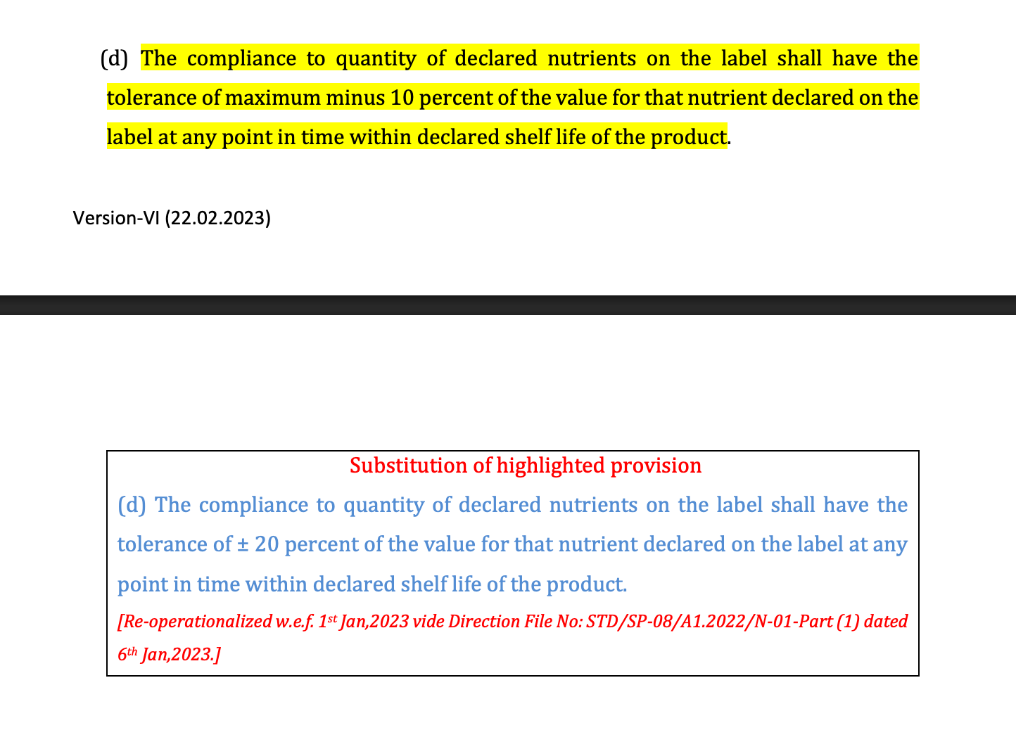 Here's a little-known regulatory detail: FSSAI legally allows a 10% deviation from label claims for protein content and other macronutrients. In fact, this tolerance has been provisionally relaxed to ±20% under the 2023 direction.